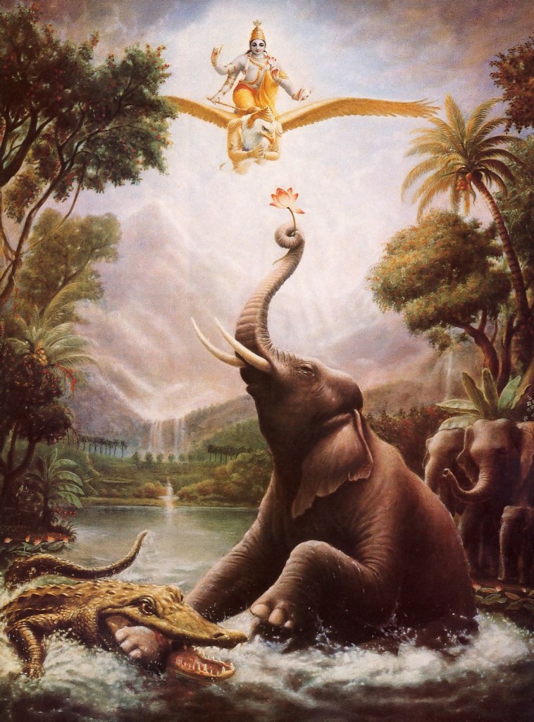 Here it is mentioned about the Gaja Hasti (king of elephants), who worshiped Narayan / Ishwar when a crocodile attacked him . Lord Vishnu saved his life after killing the crocodile.